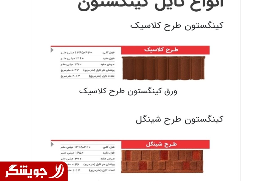 قهوه ای سوخته، قهوه ای شکلاتی، قهوه ای سفالی، قرمز، نارنجی، آبی نیسانی، آبی کربنی، زرد، سفید، مشکی مات، دودی، زرشکی در ضخامت های 40 صدم، 50 صدم، 60 صدم وزن تایل 40 صدم 1200تا1500 گرم وزن تایل 50 صدم 1500تا1700 گرم وزن تایل 60 صدم 1700تا2000 گرم قیمت تایل پرچین بر حسب ضخامت ضخامت 40 صدم قیمت (تماس بگیرید) ضخامت 50 صدم قیمت (تماس بگیرید) ضخامت 60 صدم قیمت (تماس بگیرید) نما فرم پرچین : قیمت (تماس بگیرید) تیزه گرد: قیمت (تماس بگیرید) تیزه هشتی: قیمت (تماس بگیرید) سر پنجه: قیمت (تماس بگیرید) کلاهک: قیمت (تماس بگیرید) نما سینه کفتری متری: قیمت (تماس بگیرید) لمبه سفید متری : قیمت (تماس بگیرید) لمبه جوشی متری : قیمت (تماس بگیرید) ????ورق تایل کینگستون