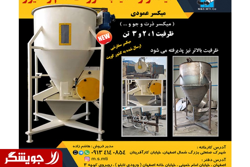میکسر و آسیاب عمودی خوراک دام و طیور - دامداری میسکر ذرت ، جو ، کنجاله و ... ظرفیت تولید : 1 ، 2 و 3 تن ( ساخت میکسر سفارشی نیز پذیرفته می شود ) جهت اطلاع از مشخصات فنی و قیمت با ما تماس بگیرید