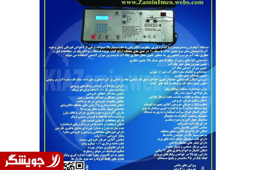 فروش ویژه دستگاه ژئوالکتریک آبیاب اتومات RS مدل PRO ساخت و تولید مهندسی زمین ایمن با سنسور و پروسسورهای اروپایی و آمریکایی دستگاه ژئوالکتریک RS اتوماتیک وسیله ای بسیار مناسب و کاربردی جهت انجام پروژه های اکتشاف آبهای زیرزمینی است. این دستگاه سرعت انجام پروژه را چندین برابر افزایش می دهد و همچنین دقت دستگاه بسیار بالا و در حدود 99.5 درصد است چرا که عملیات تنظیم ولتاژو جریان تزریقی به زمین و همچنین حذف پتانسیل خودزای زمین (Self Potential) به صورت کاملا اتوماتیک و دیجیتالی در کسری از ثانیه انجام می شود. دستگاه ژئوالکتریک اتومات RS دارای قابلیت های زیر است: عملکرد کاملا اتوماتیک با فشردن دکمه ی تریگر دارای ماژول هوشمند انتخاب ولتاژ دارای ماژول اندازه گیری و نمایش جریان بسیار دقیق تا دهم میلی آمپر دارای ماژول اندازه گیری و نمایش ولتاژ بسیار دقیق تا صدم میلی ولت سرعت بالا در اندازه گیری و محاسبات دارای پردازشگر 16 میلیون محاسبه در ثانیه محاسبه و نمایش آنلاین پتانسیل زمین با دقت صدم میلی ولت سامانه ی صفر اتوماتیک برای ولتاژ زمین در لحظه ی اندازه گیری دارای ماژول محاسبه و نمایش کیفیت جریان تزریقی به زمین و وضعیت الکترودهای جریان Qi دارای ماژول محاسبه و نمایش کیفیت ولتاژ الکترودها زمین و وضعیت الکترودهای ولتاژ Qv سامانه ی حافظه ی فعال در محاسبه ی اختلاف پتانسیل زمین DSP سامانه ی کالیبراسیون سرخود با صفحه کلید ژله ای نمایشگر ولتاژ 420 کاراکتر با روشنایی BackLight تریگر تست با قابلیت شناسایی سطح پایین زمان دار امکان کار با انواع باطری های 12 ولت ایزولاسیون کامل مدارهای قدرت، آمپرمتر، فرمان، پروسسور و ADC مبدل ولتاژ قدرت با تفکیک پذیری عالی بدنه ارتفاع بلند و عایق ولتاژ بالا و مقام در مقابل پوسیدگی قابلیت کار با جنس الکترودهای مختلف و پات ها رزولوشن بسیار بالای 20 بیتی با تکرارپذیری عالی در اندازه گیری ها یک سال گارانتی وده سال خدمات پس از فروش