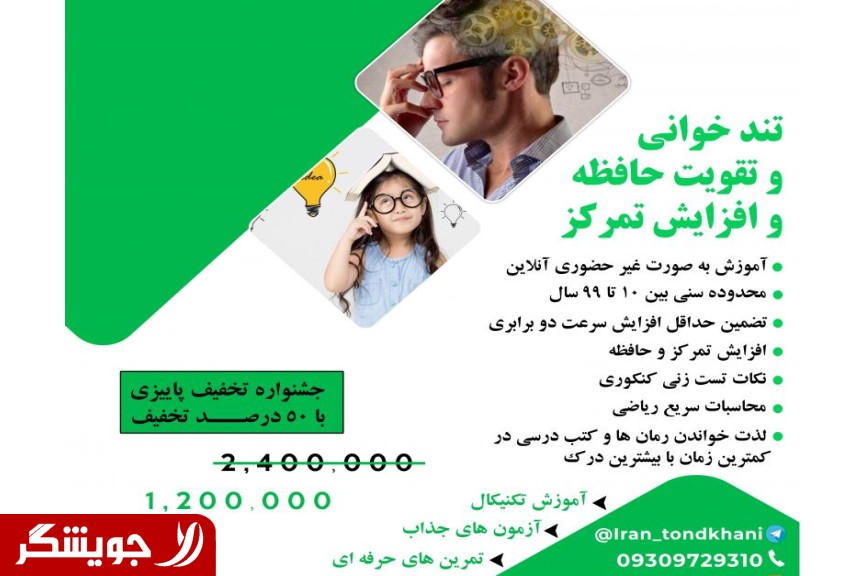 آموزش به صورت غیرحضوری آنلاین به صورت خصوصی محدوده سنی بین 10 تا 99 سال تضمین حداقل افزایش سرعت دوبرابری افزایش تمرکز و حافظه نکات تست زنی کنکوری محاسبات سریع ریاضی لذت خواندن رمان ها و کتب مختلف در کمترین زمان ممکن خواندن جزوات و کتب درسی در کمترین زمان با بیشترین درک آموزش تکنیکال شما از لحظه شروع دوره به روش‌های مختلف توسط مربی خود حمایت و پشتیبانی می‌شوید و آموزش‌های آنلاین تخصصی مربی سطح بالا در اختیار شما خواهد بود.