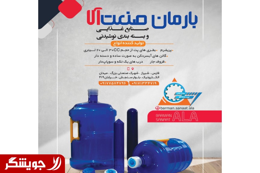 شرکت بارمان صنعت آلا تولیدکننده انواع پریفرم دهانه 55 و گالن های ۱۰ ، ۱۵ و ۲۰ لیتری ابسردکن ، انواع بطری پت در حجم های ۳۰ سی سی الی ۲۰ لیتر