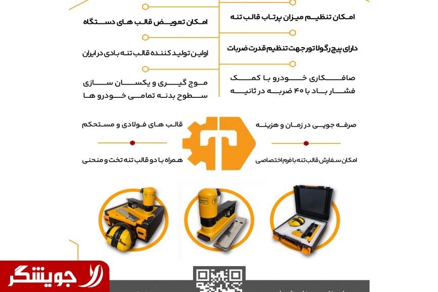 ویژگیهای چکش صافکاری بادی تیماتک این محصول در هر ثانیه 45 ضربه وارد میکند که سرعت عمل استادکار صافکاری را بسیار بالا میبرد، همچنین با وجود پیچ رگولاتور کنترل فشار باد، میتوان قدرت ضربات را کم یا زیاد کرد.
