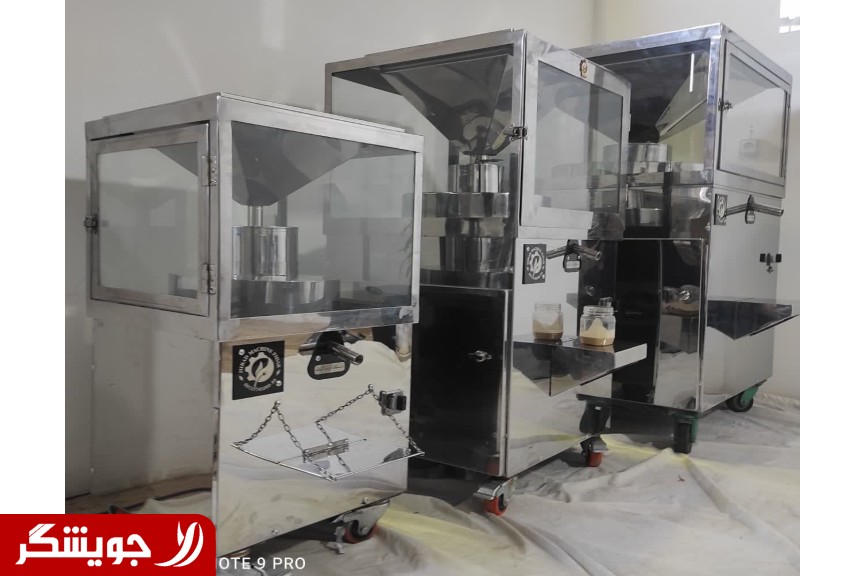 دستگاه ارده گیر سنگی سنگ مهریز بدنه استیل دارای محفظه شفاف در ظرفيت های مختلف از تولید ارده 2 کیلو در ساعت تا 20 کیلو در ساعت موتور گیربکس ایلماز ترکیه یا چین طبق سفارش دارای چرخ قفل دار
