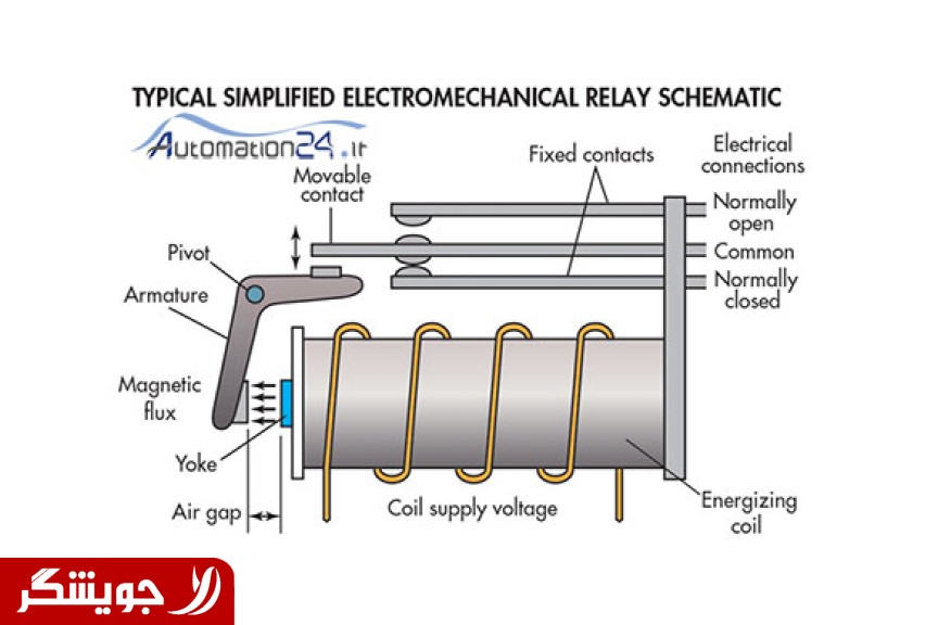 فنر سیم پیچ جهت مگنت کردن تیغه ها تیغه های کنتاکت هسته آهنی نکته) رله ها قبلاً بیشتر به صورت الکترو مکانیکی ساخته میشدند اما امروز با پیشرفت تکنولوژی رله های اکترونیکی از جمله رله SSR و غیره نیز ساخته شده است.