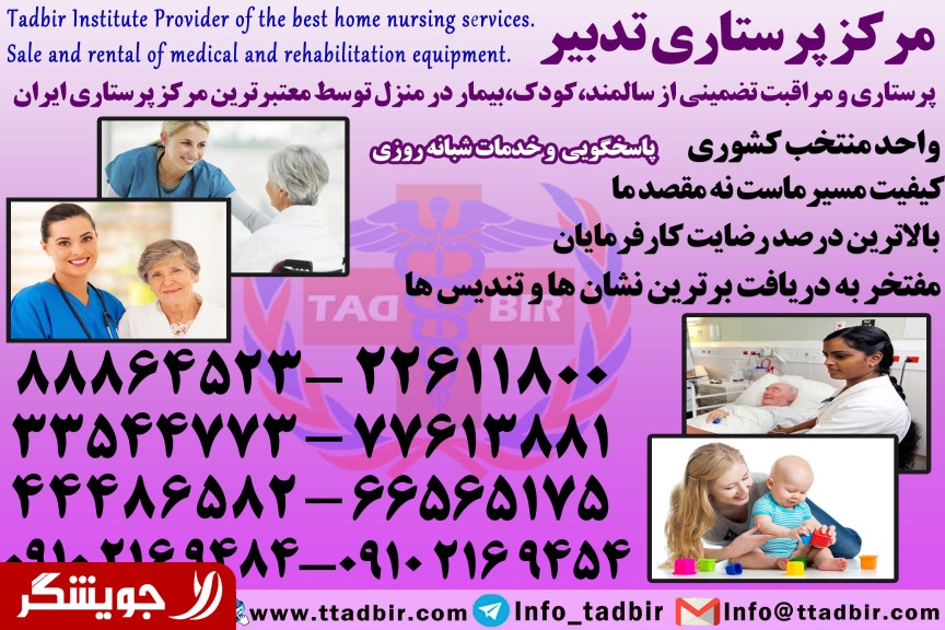 *** مرکز شبانه روزی وچند منظوره تدبیر با کسب مجوز رسمی به شماره ثبت 838 وشناسه ملی (در پایین آگهی) که ابلاغیه قانونی آن به اداره کل ثبت شرکت ها و موسسات غیر تجاری ، روزنامه رسمی کشور وسازمان ثبت اسناد و املاک کشور رسیده است با محوریت اصلی مشتری مداری پس از اخذ کلیه مجوزهای لازم از مراجع ذی صلاح تاسیس و فعالیت خود را با توجه به نیاز هموطنان عزیز با همکاری متخصصین و پرسنل های آماده ، دلسوز، مجرب ، مطمعن ، کارکشته و قابل اعتماد و اطمینان جهت ارائه کلیه خدمات مراقبت و نگهداری از سالمند بیمار کودک در منزل با عقد قرارداد رسمی وضمانت های لازم در خدمت خانوداه های محترم متقاضی میباشد.