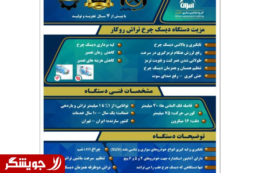 نسل پنجم دیسک تراش تولید دیسک تراش در چهار مدل شاسی یک تیکه و سه تیکه ( آلومینیومی و فولاد چدنی) نصب و آموزش رایگان تضمین و اصالت قطعات تایوان و موتور آلمان را به شما میدهیم. تابگیری و لبه گیری انواع دیسک چرخ خودرو های سواری و شاسی بلند. تنها دستگاهی که دیسک های چرخ عقب را میتراشد دارای مجوز رسمی و طرح صنعتی تراش دوطرفه و همزمان دیسک دقت 0/01 دستگاه تمام اتوماتیک بودن دستگاه تنظیم سرعت ماشین تراش و.... دارای سنسور قطع کن اضطراری سیستم فن خنک کننده بازدهی اقتصادی عالی طیف رنگی گسترده متریال عالی پایه آیرودینامیک پاور (پایداری بیشتر) رنگ بدنه باکس کوره ای (الکترواستاتیک) چراغ LED شب شکست قیمت