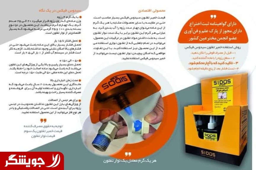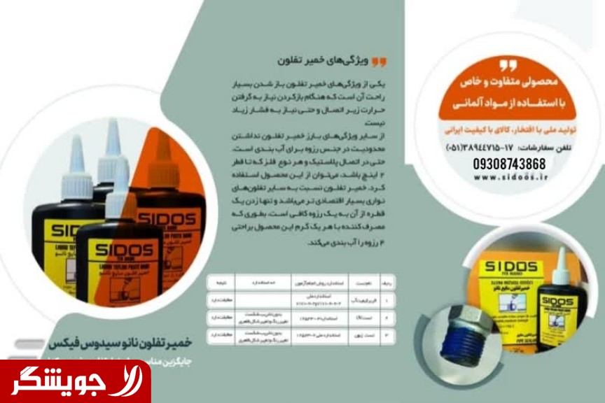 ***خمیر تفلون نانو سیدوس فیکس : تکنولوژِی نانو در تولید محصولی پرکاربرد دست به کار گردیدومحصولی ویژه تولید نمود که در صنعت کاربرد ویژه ای دارد. خمیر تفلون نانو فیکس ,نسبت به سایر تفلون های مایع و نسبت به سایر تفلون های نواری بسیار اقتصادی تر می باشد!! *خمیر تفلون نانو سیدوس فیکس این خمیر در حجم های 40 میل، 100 میل، 120 میل و 200 میل تولید می شود و برای مصارف ساختمانی و انواع اتصالات برنجی، گالوانیزه و پلی اتیلن به کار می رود. **** روش اجراع **قبل ازمصرف قوطی را خوب تکان دهید ... یکی دو قطره روی رزوه ،آغشته کرده و با آچار سفت میکنیم !! زمان ثابت شدن آببندی بسیار کوتاه است. ** نانو سیدوس فیکس !! حالت قفلشوندگی ندارد **محدودیت اتصال نداره و روی همه اتصالات از جنس برنج، گالوانیزه و پلی اتیلن قابل استفاده **تاریخ انقضا 5سال **دارای گواهی ثبت اختراع **دارای گواهی بهداشت آب شرب از استاندارد **دارای مجوز تولید از پارک علم و فناوری