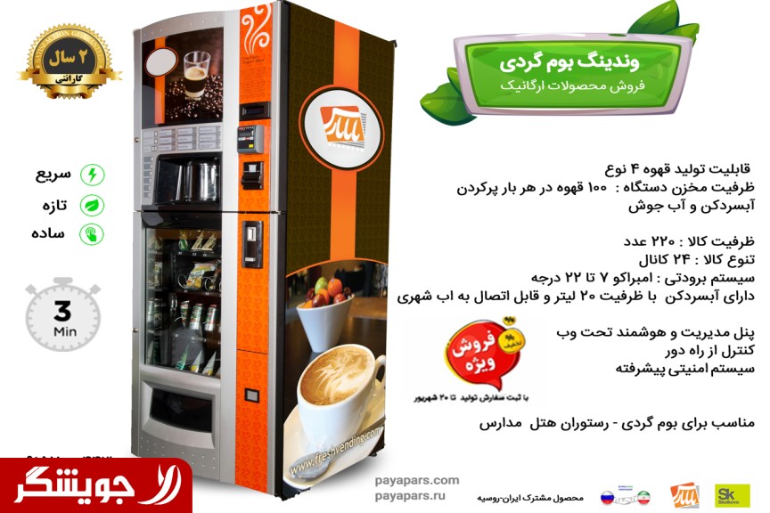 وندینگ نوشیدنی سرد و گرم - دو منظوره مدل: چند منظوره سیستم اوردینگ: پرتابی و همزمان تنوع کالا: 40 تا 42 کانال سیستم برودتی: +7 تا 25 درجه سانتیگراد کنترل پنل: صفحه کلید و کنترل پنل مدیریت تحت وب ابعاد: 85 عرض - طول 95 و ارتفاع 180 سانتیمتر تخفیف : به مدت محدود تحویل : یک ماهه گارانتی: تعویض تمامی قطعات تا یک سال بدون قید و شرط