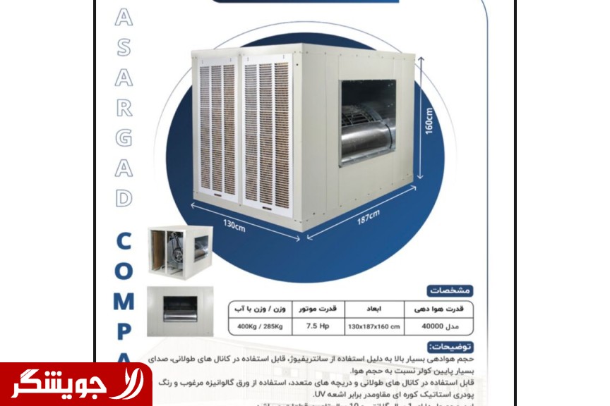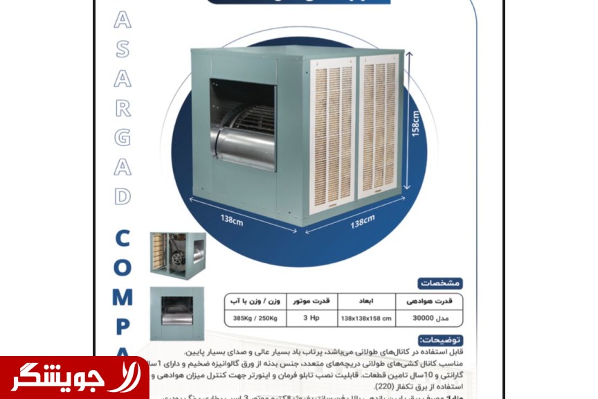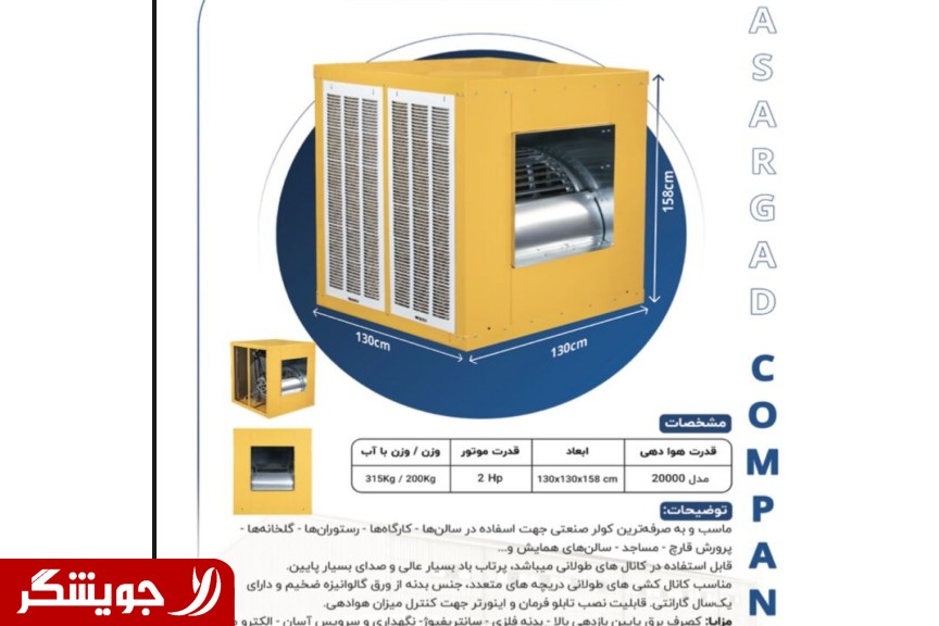 کولرهای صنعتی پاسارگاد با باد دهی و سرمایش فوق العاده مناسب برای ساختمان های صنعتی و اداری با ابعاد بزرگ مانند سوله ها تالار ها سالن های همایش پرورش قارچ و... قدرت هوا دهی کولر 22 هزار متر مکعب در ساعت سه طرف کولر دارای توری و پوشال قابل تعویض کولر در مدل فن سانتریفیوژ وموتور سه فاز با رنگ پودری الکترو استاتیک کوره ای کولر دارای پمپ آب 220 ولت تکفاز و وان مربوطه و شناور مخصوص می باشد . مزایای کولر صنعتی - کولر صنعتی کولر گارگاهی مناسب سالن سوله کارخانه و... -خنک سازی فوق العاده کولر صنعتی -پرتاب هوا عالی به وسیله کولر صنعتی -بسیار کم صدا نسبت به قدرت کولر و کولرهای مشابه. -مصرف برق بسیار کم تقریبا" معادل یک چهارم کولرهای مشابه -کولر صنعتی در انواع( 25000)،( 35000)،(45000) میباشد نمایندگی اصلی کارخانه بزرگ پاسارگاد تولید و توزیع انواع قطعات و کولر های صنعتی