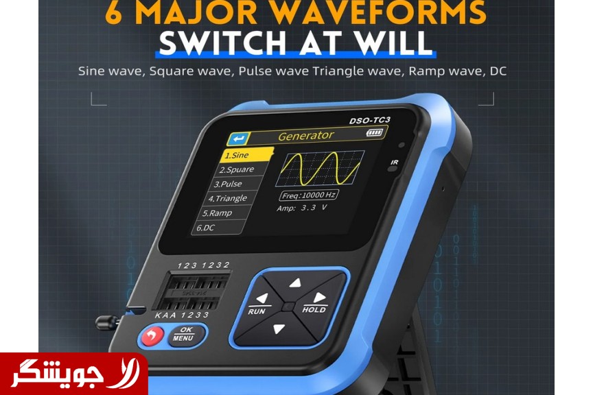• سیگنال ژنراتور: این دستگاه مجهز به یک فانکشن ژنراتور داخلی است که می‌تواند 6 نوع شکل موج استاندارد (سینوسی، مربعی، پالسی، مثلثی، رمپ و DC) با فرکانس تا 100KHz و ولتاژ خروجی 3.3V تولید کند. این ویژگی برای تست مدارات آنالوگ، درایورها و عیب‌یابی مدارهای الکترونیکی بسیار مفید است.