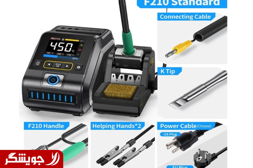 یکی از برجستهترین ویژگیهای این مدل، پشتیبانی همزمان از دو نوع دسته محبوب F210 و F245 است. پکیج استاندارد این محصول با دسته F245 عرضه میشود که برای کاربردهای عمومی و لحیمکاری قطعات بزرگتر بسیار مناسب است و به کاربر اجازه میدهد تا اکثر پروژههای خود را به راحتی انجام دهد.