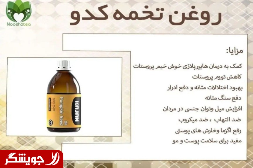 کمک به درمان و کاهش تورم غده خوش خیم پروستات بهبود اختالالت مثانه ودفع ادرارو دفع سنگ مثانه افزایش میل و توان جنسی در مردان ضد التهاب و ضد میکروب و ضدانگل و کرم های روده ای رفع اگزما و خارش های پوستی مفید برای سالمت پوست و مو برطرف کننده دردهای پیش از قاعدگی در زنان درمان ریزش مو ارثی مردانه موارد منع مصرف: مصرف این فرآورده برای افرادی که سابقه حساسیت به گیاهان خانواده کدوئیان را دارند، ممنوع است