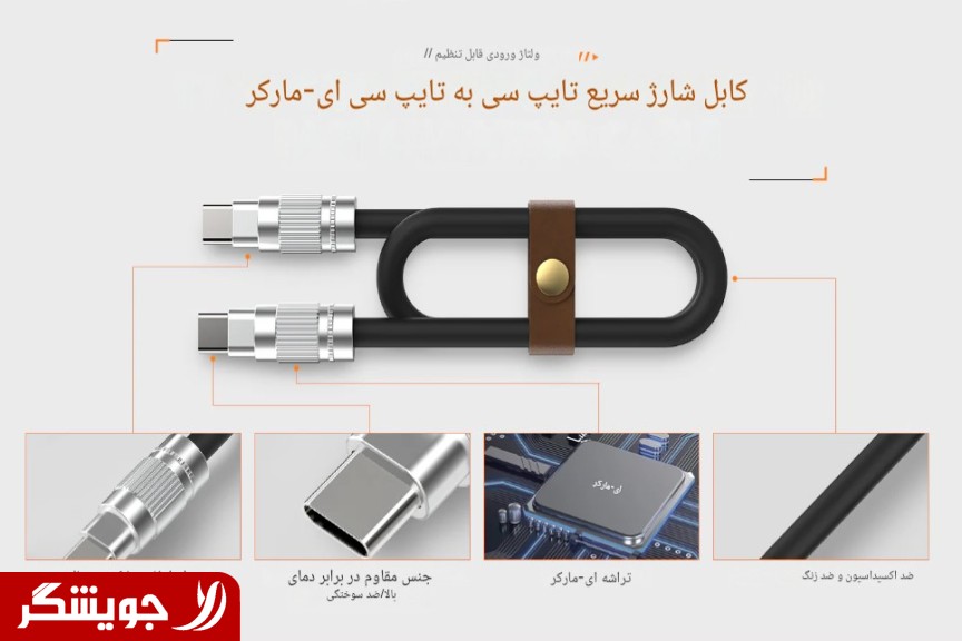 • تراشه هوشمند E-Marker: قلب تپنده این کابل، چیپ هوشمند E-Marker است. این تراشه به صورت خودکار با دستگاه شما ارتباط برقرار کرده و ولتاژ و جریان را به شکلی ایمن و بهینه تنظیم می‌کند. این فرآیند هوشمند، سلامت باتری دستگاه شما را تضمین کرده و از هرگونه آسیب ناشی از نوسانات برق جلوگیری می‌کند.
