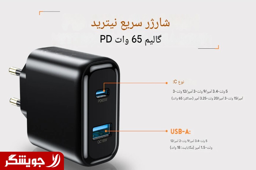 شارژر 65W دو پورت USB-C (PD) و USB-A (QC)