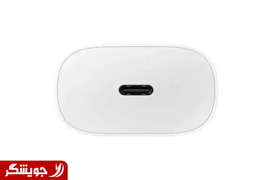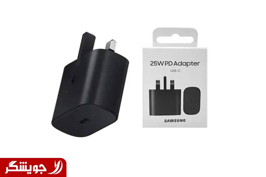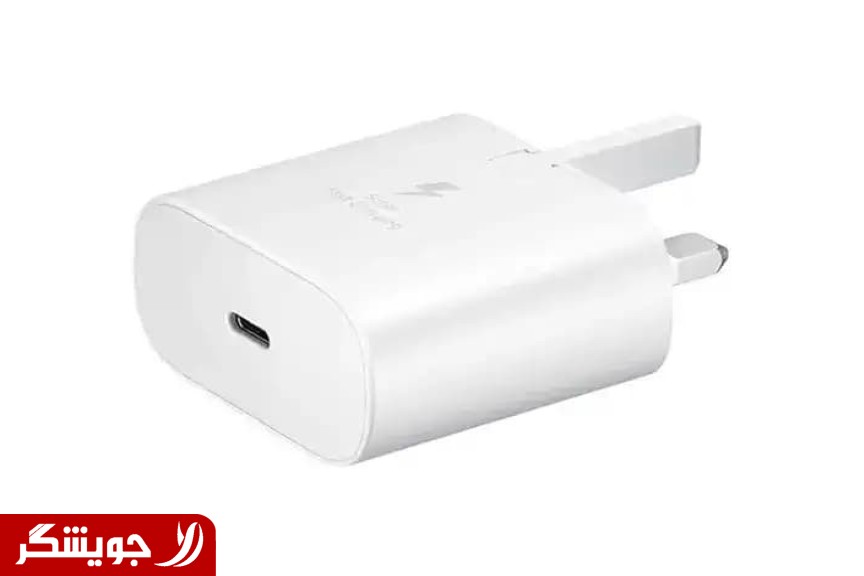 طراحی شارژر 25 واتی سامسونگ اصلی مشابه دیگر محصولات سامسونگ است و با پین‌های سه‌گانه خود، اتصال به برق شهری را فراهم می‌آورد. برای اتصال این شارژر به پریز، نیاز به یک تبدیل دارید. در یک سمت این آداپتور، درگاهی از نوع تایپ سی (USB-C) قرار دارد که برای استفاده از آن باید از کابل تایپ سی با کانکتور مناسب استفاده کنید.