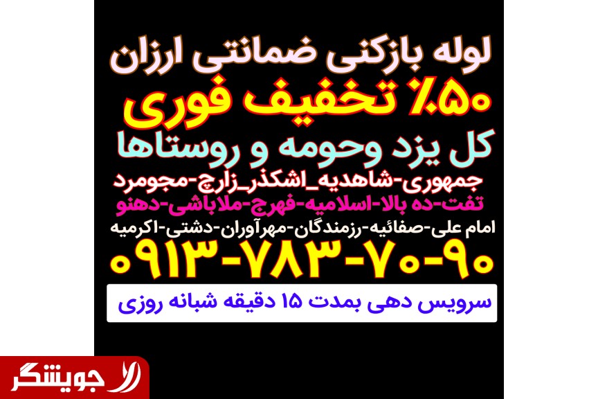 ✔️✔️ خدمات لوله بازکنی فنرزنی چاه بازکنی ✔️✔️ شبانه روزی 100٪ضمانتی ❌❌ 50٪تخفیف ❌❌ ★ تمام نقاط یزد و اطراف در کمترین زمان ممکن ★ ✓با دستگاه های مدرن و پیشرفته ژنراتوری آلمانی✓ بدون خراب کاری و کثیف کاری★کمترین نرخ★ ↙️باز کردن تمام کفشورها و راه آب ها ضمانتی↘️ آشپزخانه★حمام★پارکینگ★حیاط★پشت بام توالت فرنگی و ایرانی و غیره ✴️ انجام کار توسط افراد کار بلد و ماهر ✴️ جرم گیری و رسوب تراشی به صورت تخصصی ✔️✔️با فنرهای مخصوص و صنعتی ✔️✔️ ★کمترین نرخ بین تمامی همکاران بشرط★ در آوردن اشیا از داخل لوله ها طلا★موبایل★سوئیچ★پول و... ✴️✴️با یک تماس مشتری دائمی ما شوید✴️✴️