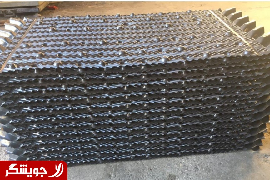 ج) ذوزنقه ای (بدون قطره گیر) پکینگ برج ابارا شانه تخم مرغی این تیپ همانند شانه تخم مرغی ساده بوده و بصورت بلوکی تولید می‌گردد. ورق های تشکیل دهند به شکل ذوزنقه قائم الزاویه دارای دو مقطع غیر همسان می‌باشد. این مدل در برج‍های خنک کننده کراس فلو ذوزنقه ای همچون تصویر زیر کاربرد دارد. مزایای پکینگ شانه تخم مرغی pvc